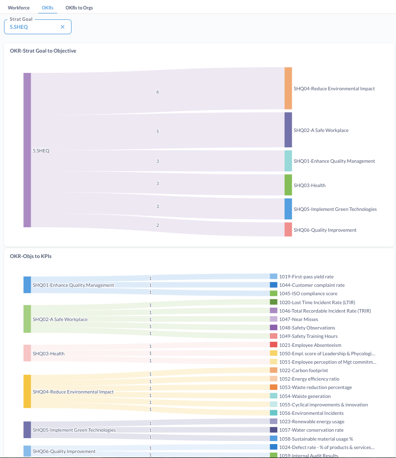 The HR dashboard also shows the Objectives, and KPI’s per objective organisations and staff is measured to this year. Only SHEQ objectives was chosen on the filter on the top-graph.
