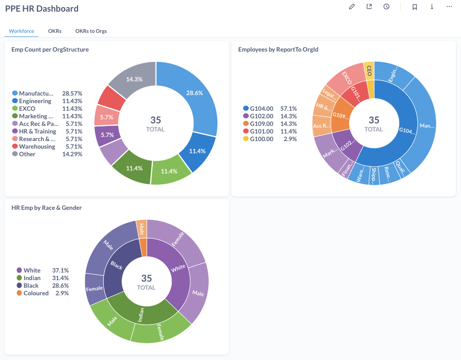 A second EXCO dashboard shows the HR workforce headcount per organisation, reporting structure, and per race and gender grouping.
